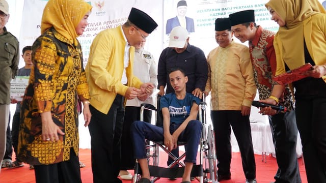 Berandang – Gubernur Rohidin Mersyah menyampaikan bantuan bedah rumah program Badan Amil Zakat Nasional (Baznas) Provinsi Bengkulu kepada 4 Keluarga Penerima Manfaat (KPM) dan sekaligus peletakan batu pertama di Desa Pulo Geto Baru, Kecamatan Merigi, Kabupaten Kepahiang, Minggu (23/7).