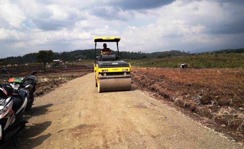 Tampak tandem roller dari Dinas PU Kabupaten Brebes yang dikemudikan Dedi (42), terus melakukan pemampatan agregat pasir dan batu (sirtu), di sejumlah titik jalan yang telah selesai dilakukan penaburan.