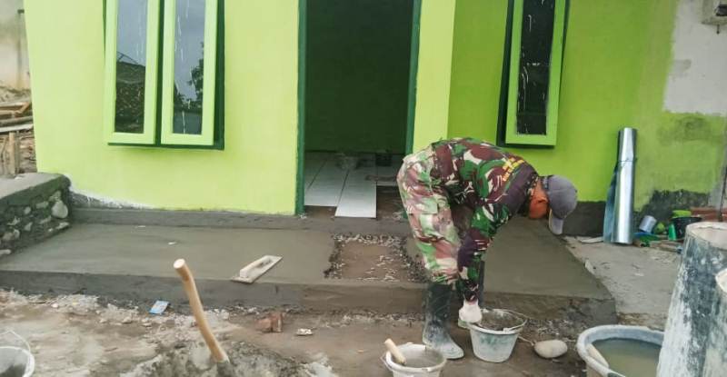 Tampak Sertu Sudirso, salah satu teknisi bangunan Kodim 0713 Brebes, terus menyempurnakan lantai teras, di rumah yang berukuran 5 x 9 meter itu. Jumat (16/10/2020).
