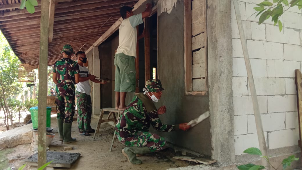 Pati – TNI Manunggal Membangun Desa (TMMD) Reguler Ke-111 TA.2021 Kodim 0718/Pati, anggota Satgas TMMD bersama warga telah selesai mengerjakan plester dinding Rumah Tidak Layak Huni (RTLH) milik Rusnawi (64), pengerjaan sasaran fisik rehab rumah terus dikebut. Selasa (13/7/2021)