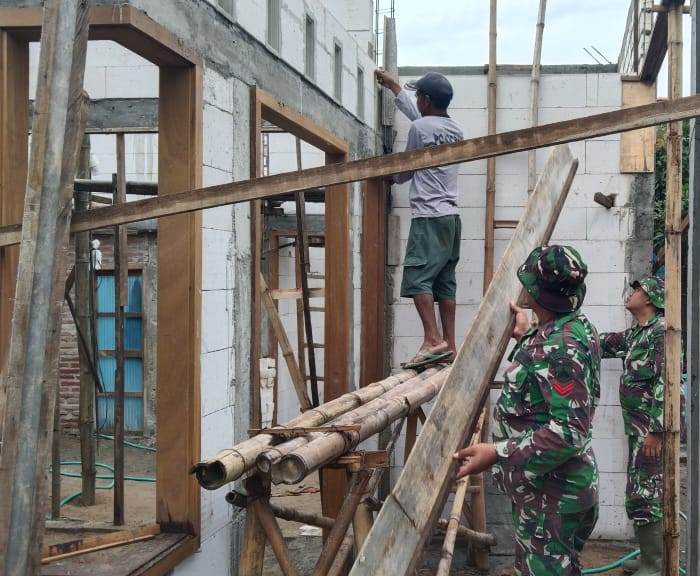 Tak terkecuali dengan pembuatan rumah Santoso, salah satu warga Tugiman dan anggota Satgas TMMD Koptu Siswanto yang bertugas untuk memasang papan cor dengan cekatan segera merakitnya.