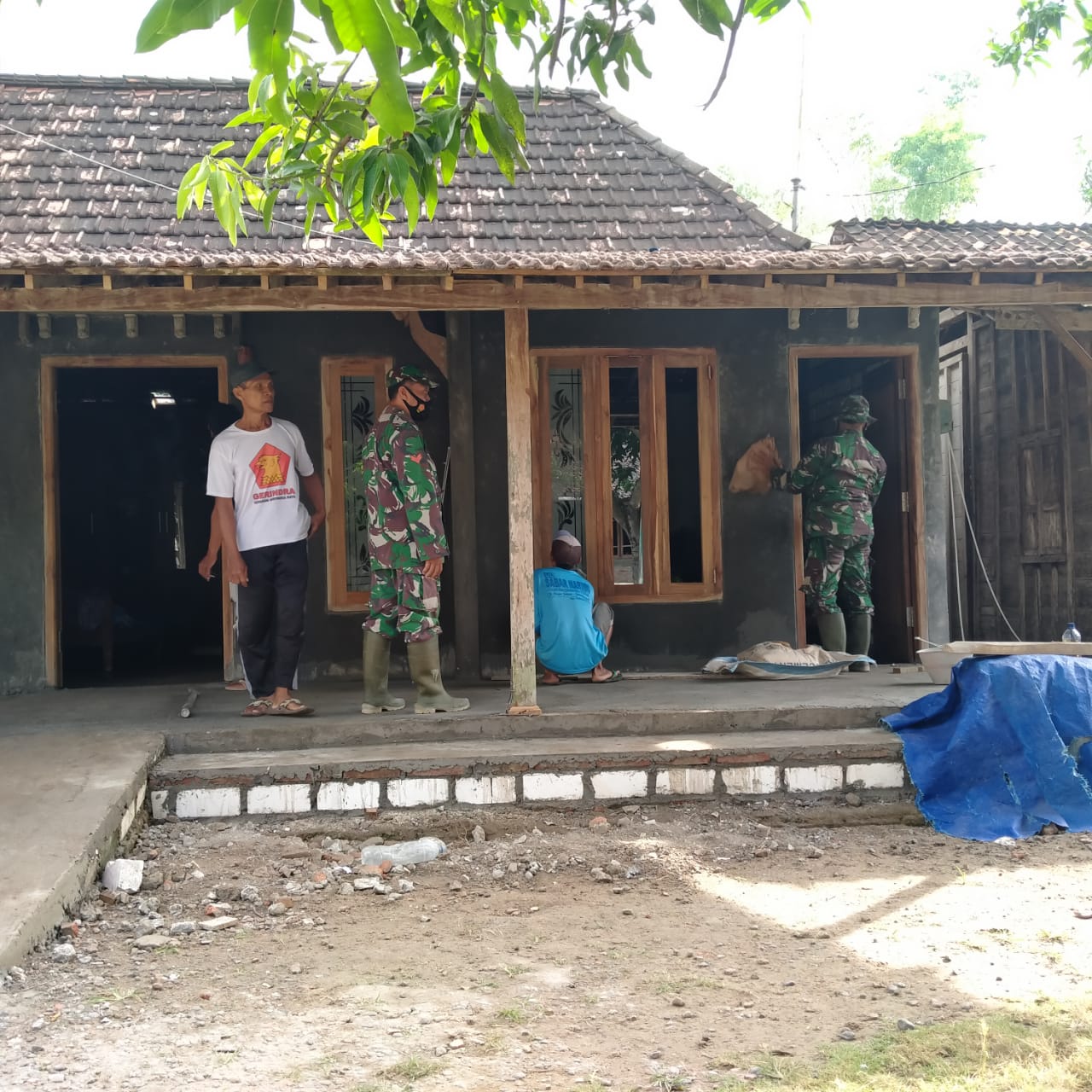 Agar mempercepat penyelesaian pembangunan, Kopda Sukamto(37) membantu pemasangan kaca pada kusen jendela, sedang rekannya anggota TNI yang lain terlihat sedang menggosok bekas acian dengan menggunakan kertas bekas sak semen yang ada, ini dilakukan agar dinding bisa halus maksimal.