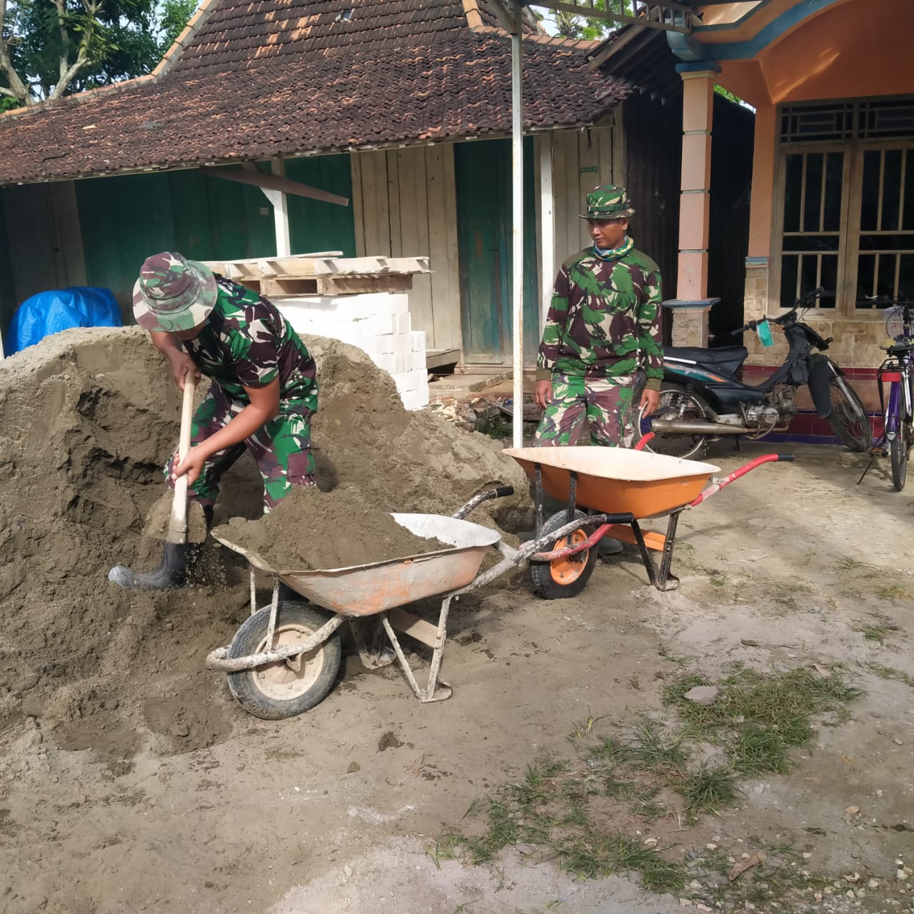 Gundukan pasir yang ada di depan perumahan warga menjadi saksi kegiatan anggota satgas TNI di Desa Tamansari. Dengan gigihnya mereka memasukkan pasir ke dalam bak gerobak arco untuk kemudian dilangsir ke pelataran Mushola Nurul Iman.