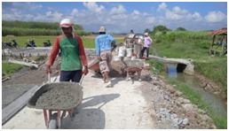 dengan cuaca yang hangat kian menambah semangat untuk bekerja dan berkarya bagi Anggota Satgas dan Masyarakat, Dengan semangat gotong royong mereka mulai melaksanakan pengecoran jalan penghubung desa sepanjang 1.450 M dengan lebar 2,6 M dan ketebalan 17 cm yang seyogyanya sudah hamper selesai mereka dengan alat angkong mengangkat hasil adukan dari mesin mulen betonisasi jalan. Dengan Angkong mereka sangat terbantu dalam pekerjaannya karenannya pekerjaan sangat terbantu dan menjadikan ringan suatu pekerjaan.
