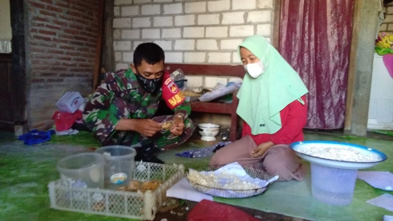Pati – Bermacam kegiatan komsos yang dilakukan Satgas TMMD reguler ke- 111 Kodim Pati menjelang akhir program. Seperti yang dilakukan Serda Irwanto dalam kesempatan ini, ia berkunjung ke rumah Rahmawati (36) warga Dukuh Kalimati, Desa Tamansari, yang sedang membuat keripik singkong untuk dijual.