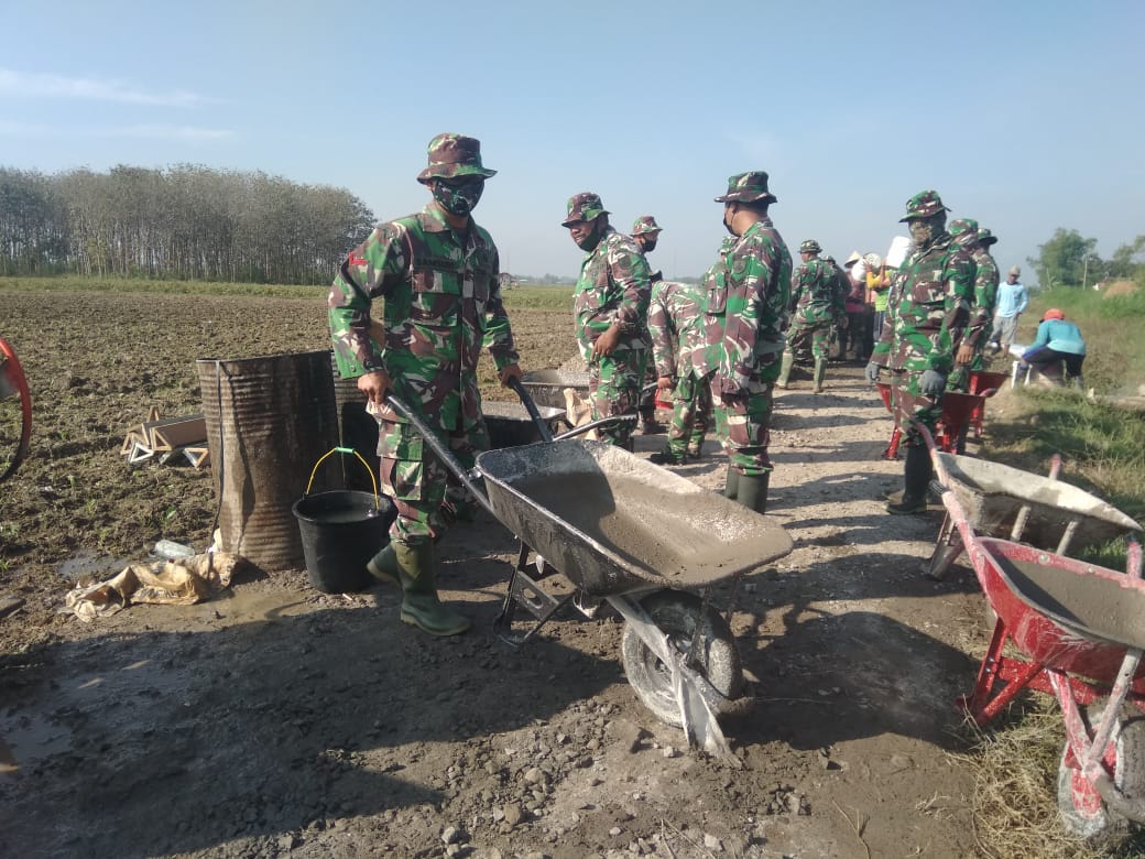 Warga dan Satgas TMMD telah siap berjajar rapi dengan menggunakan alat angkut (angkong) bawa adukan material ke sasaran fisik utama berupa pengecoran jalan sejauh 1.450 meter di area persawahan.