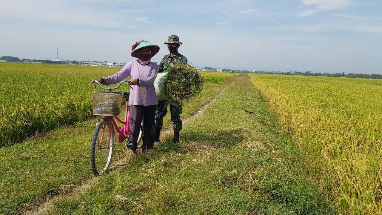 Pati – Srikah (51) warga Desa Tamansari, Kecamatan Jaken yang kesehariannya bertani kesawah dan ketika pulang selalu menyempatkan membawa rumput untuk pakan ternak kambing dirumahnya. Saat pulang ia tampak kesulitan akan menaikan rumput yang dibawanya, kebetulan saat itu Babinsa Serda Sugiyarto anggota Koramil Jaken yang sedang komsos diwilayah desa binaanya sedang melintas dan bergegas membantunya, Jum’at (16/7/2021).