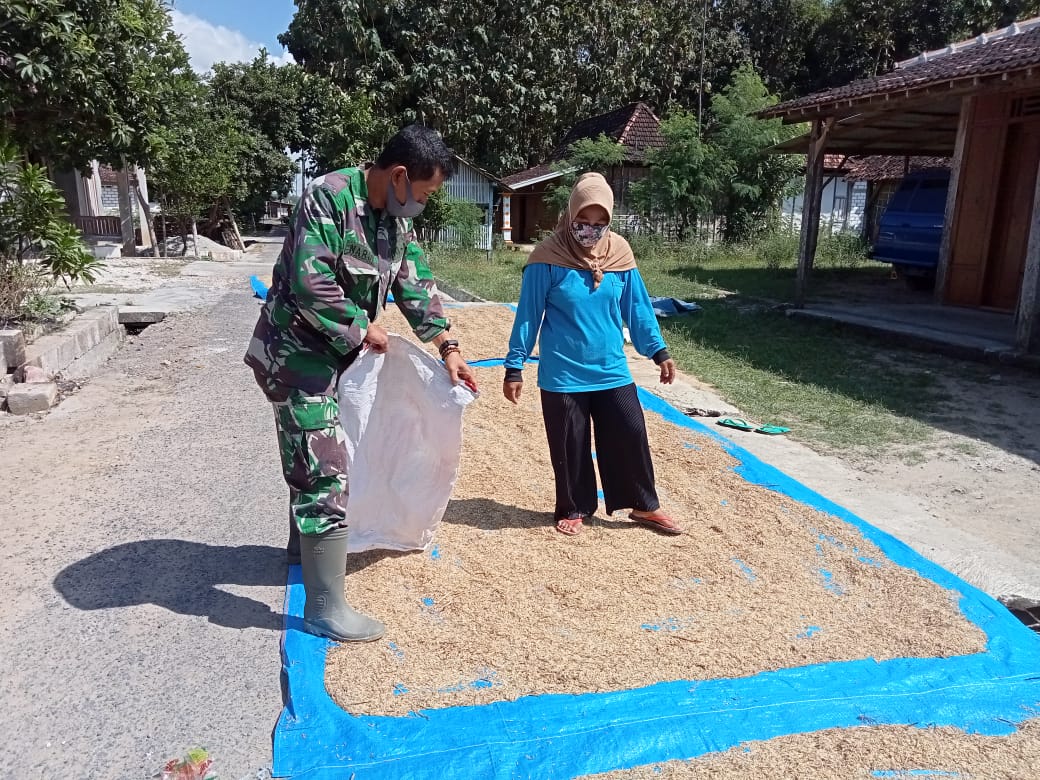 PATI – Anggota Satgas TMMD 111 Kodim 0718/Pati membantu warga menjemur padi, Itu sebagai bentuk kepedulian. Rasa kemanunggalan TNI dengan rakyat.