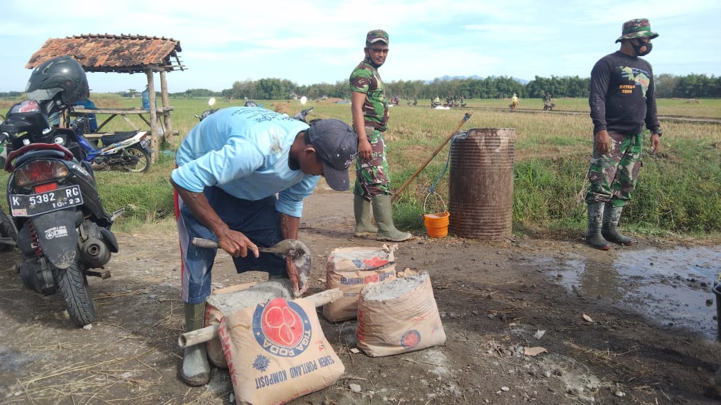 Pati –Kekompakan antara Satgas TNI Manunggal Membangun Desa (TMMD) Reguler Ke -111 Kodim 0718/ Pati dengan warga tidak diragukan lagi, Contohnya, saat itu sanggota Satgas dan warga di Desa Tamansari,Kecamatan Jaken, Kabupaten Pati. membuat adonan semen dan pasir untuk pengecoran jalan. Sabtu (26/06/2021).