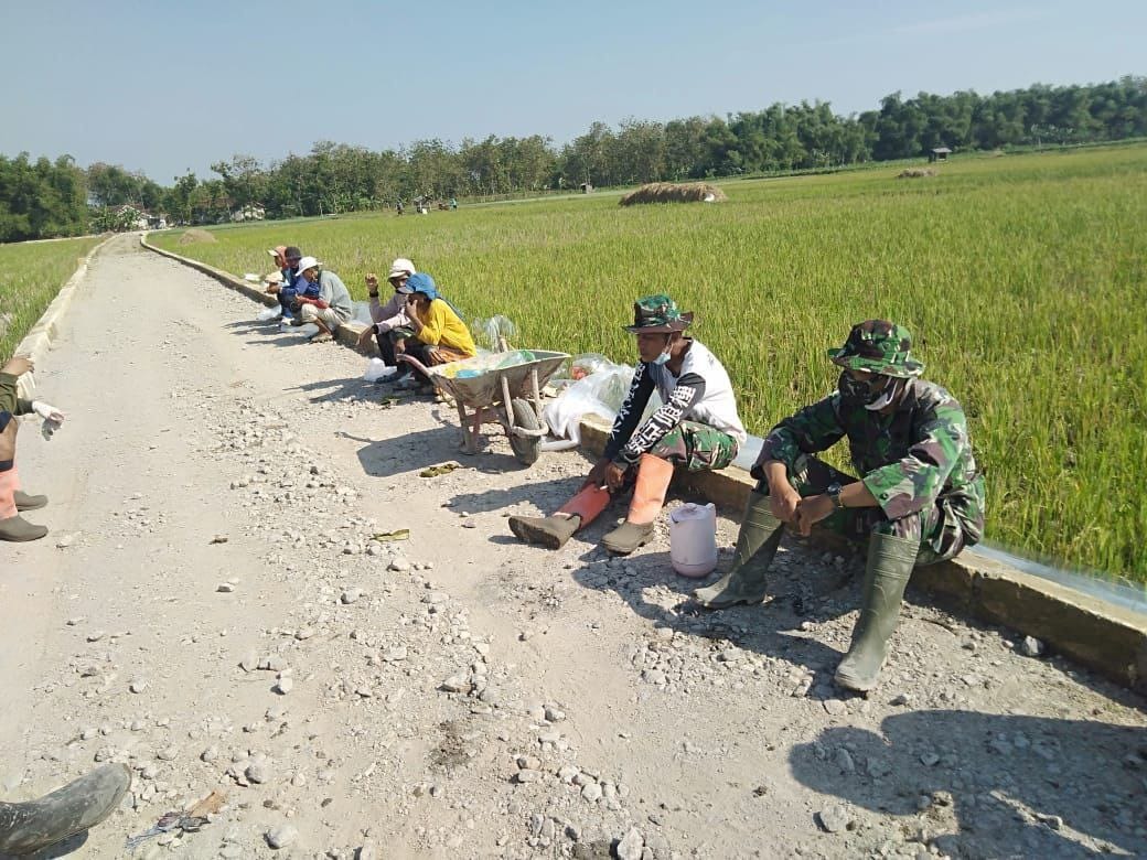 Pati – Terlihat Anggota Satgas TMMD ke-111 Kodim 0718/Pati, melaksanakan istirahat sejenak melepas lelah sambil berjemur di bawah sinar matahari pagi di kanan kiri jalan yang akan di jadikan sasaran pengecoran yang berlokasi di Desa Tamansari Kecamatan Jaken kabupaten Pati.