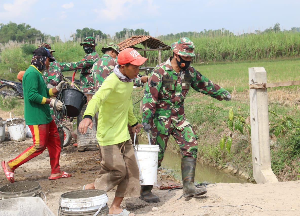 Seperti terlihat kali ini, Serka Joko Soetanto bersama Darminto (30) warga setempat sedang mengangkat ember berdua, Selasa (22/6/2021). Mereka terlihat kompak dengan langkah yang sama menuju kendaraan pengangkut adonan cor dan melangsirnya ke titik pengecoran.