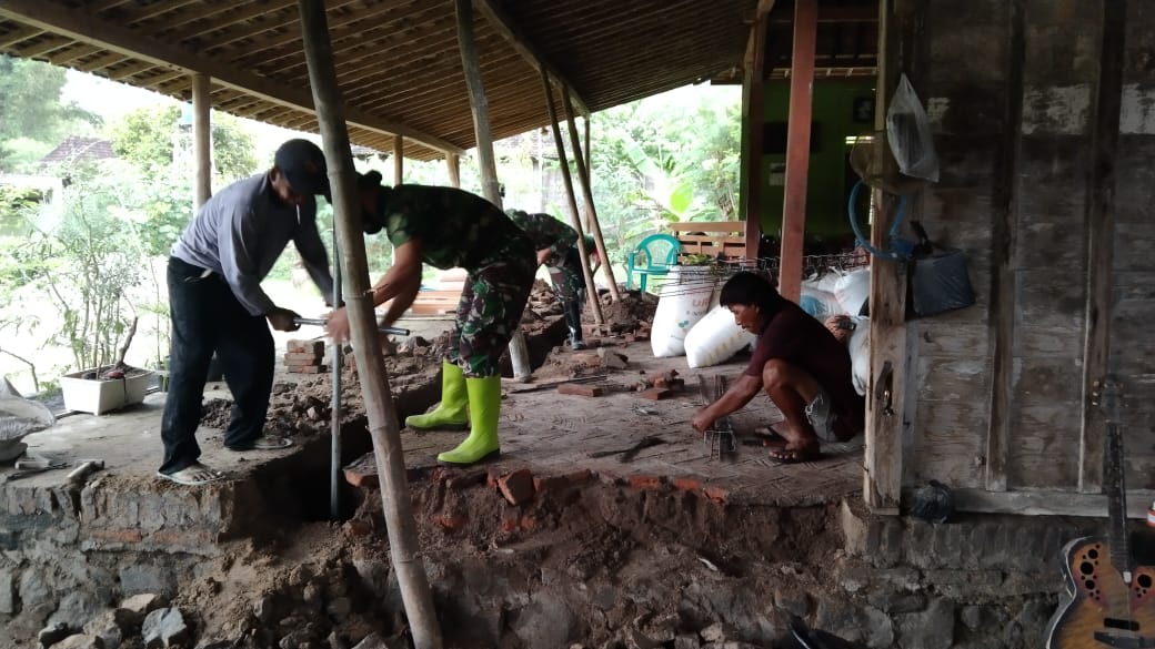 “Pengerjaan sudah dimulai sejak pagi.Pemilik rumah dan warga berjibaku mengaduk pasir, semen dan air untuk material pengisian cor dimulai dari pondasi di bagian depan, hingga tengah dan belakang, Dalam rangka kegiatan TMMD ini rumah Yarman yang dikerjakan. Sebab, rumah tua itu awalnya hanya rumah bambu dan kayu kita akan gunakan metode cor beton slop tujuannya biarkuat saja,” ujar Kapten Kav Budi Karyadi