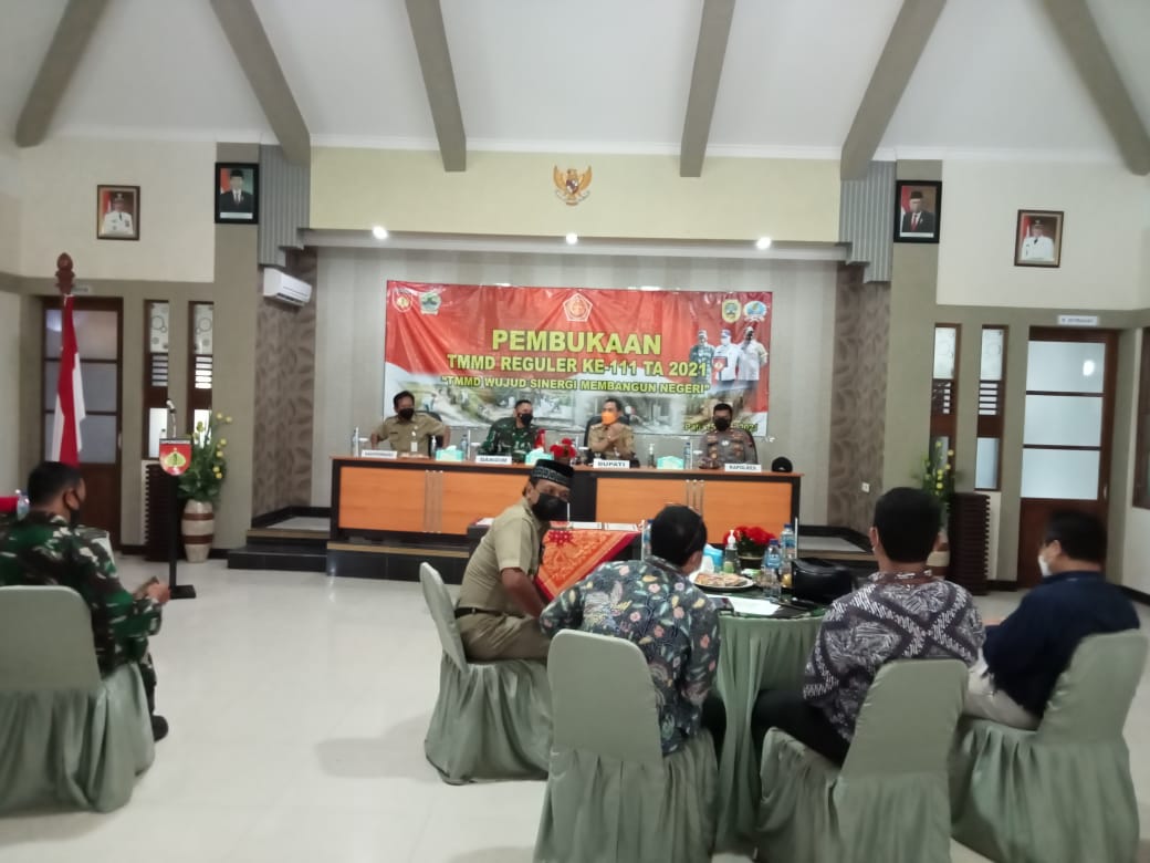 Karena situasi masih pandemi, acara pembukaan tidak dilakukan dilapangan desa lokasi TMMD, tetapi hanya di kantor balai desa dengan dihadiri unsur terkait demi menerapkan protokol kesehatan.