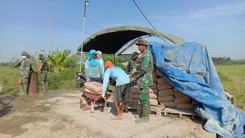 Bukan masalah bagi kami jika harus langsir material dengan panggul semen . apalagi jaraknya tidak lebih dari 100 Meter,” ungkap Serka Amino, salah satu anggota Satgas TMMD dari Koramil Jaken.