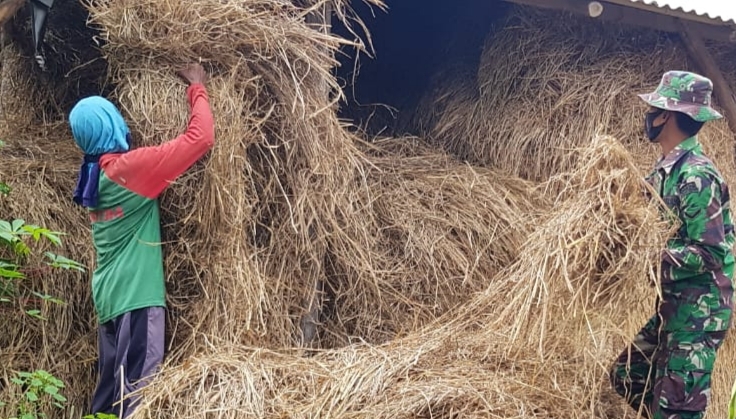Pati – Serda Sukarji anggota Satgas TMMD Reguler ke-111 Kodim Pati merasa tertarik saat melihat salah satu warga sedang menumpuk jerami kering yang diambil dari sawah. Dengan tanpa rasa canggung Sukarji pun membantunya untuk menumpuk jerami kering tersebut.