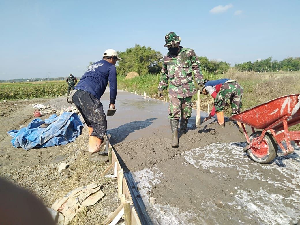 Puluhan warga Desa Tamansari bersama anggota Satgas TMMD Reguler ke 111 Kodim 0718/Pati, melaksakan pengecoran jalan di salah satu sasaran TMMD ke 111, Sabtu (19/06/2021).