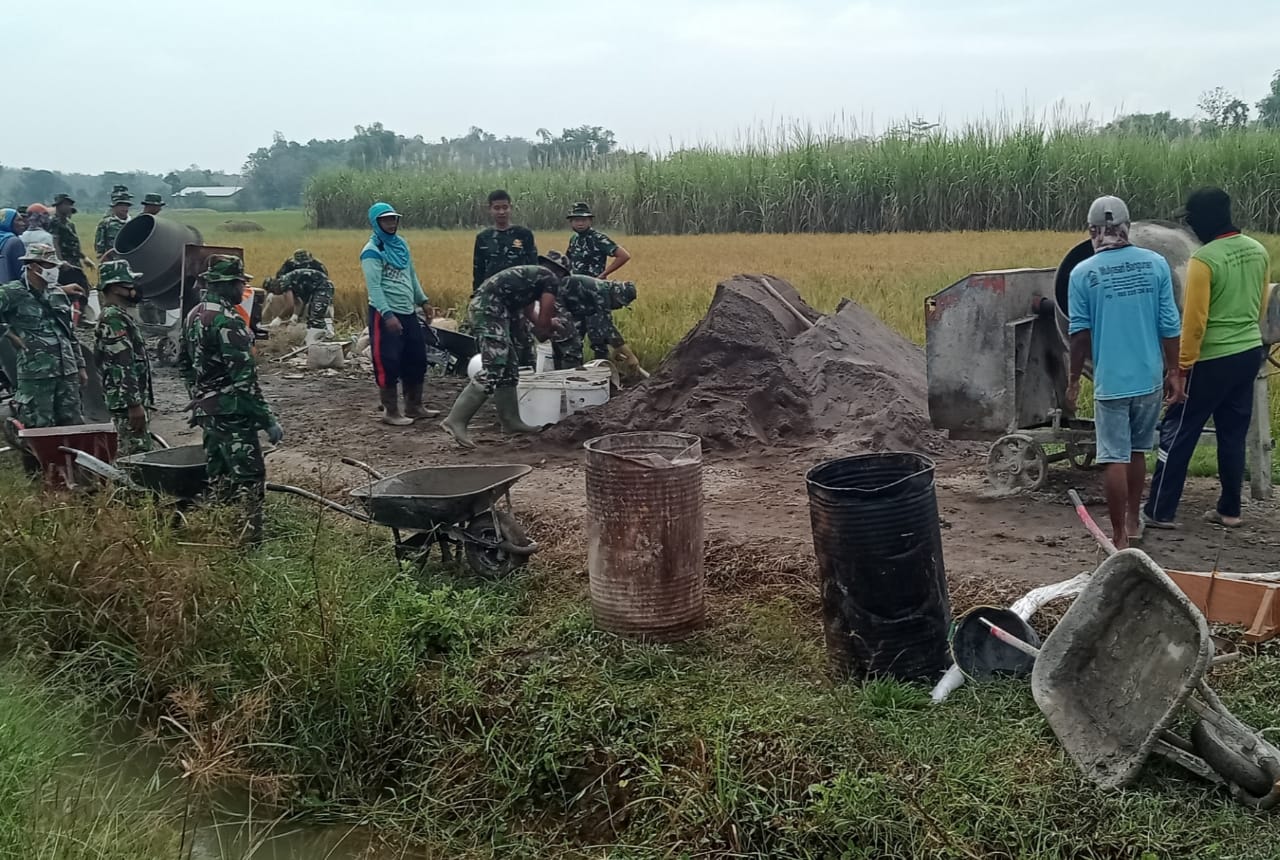 Pati – Pukul 07.00 WIB, pengerjaan sasaran fisik TMMD Reguler ke-111 Kodim Pati di Desa Tamansari, Kecamatan Jaken, Kabupaten Pati, berupa pengecoran jalan pertanian dimulai. Tampak TNI dan warga sudah siap dengan tugasnya masing-masing. Mesin molen mulai berputar, adonan cor mulai siapkan dan angkong pun mengantri disekitar mesin molen.