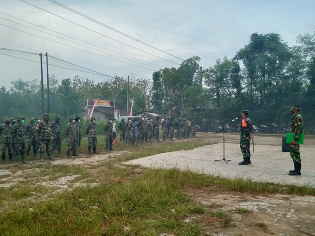 Apel pagi berlangsung dengan aman dan tertib, Dandim menyampaikan kepada seluruh anggota Satgas TMMD untuk tetap mematuhi protkes dalam melaksanakan tugasnya untuk mencegah penyebaran Virus Covid 19.