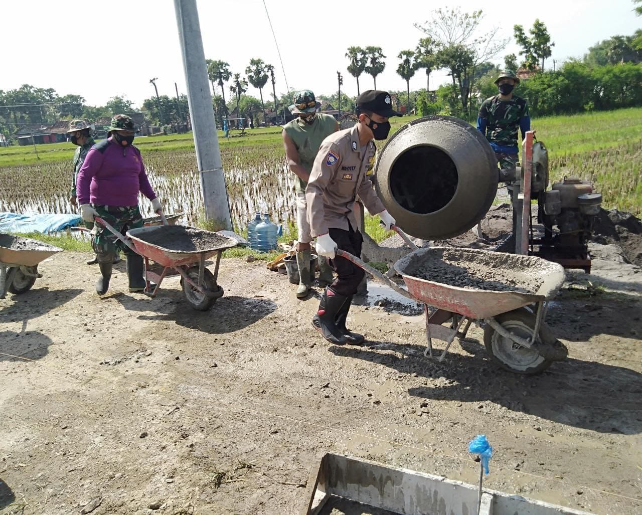 Itu terlihat saat Personil TNI dan Polri serta warga desa yang terus bahu membahu mengerjakan sasaran fisik program TMMD pengecoran jalan di Desa Tamansari.