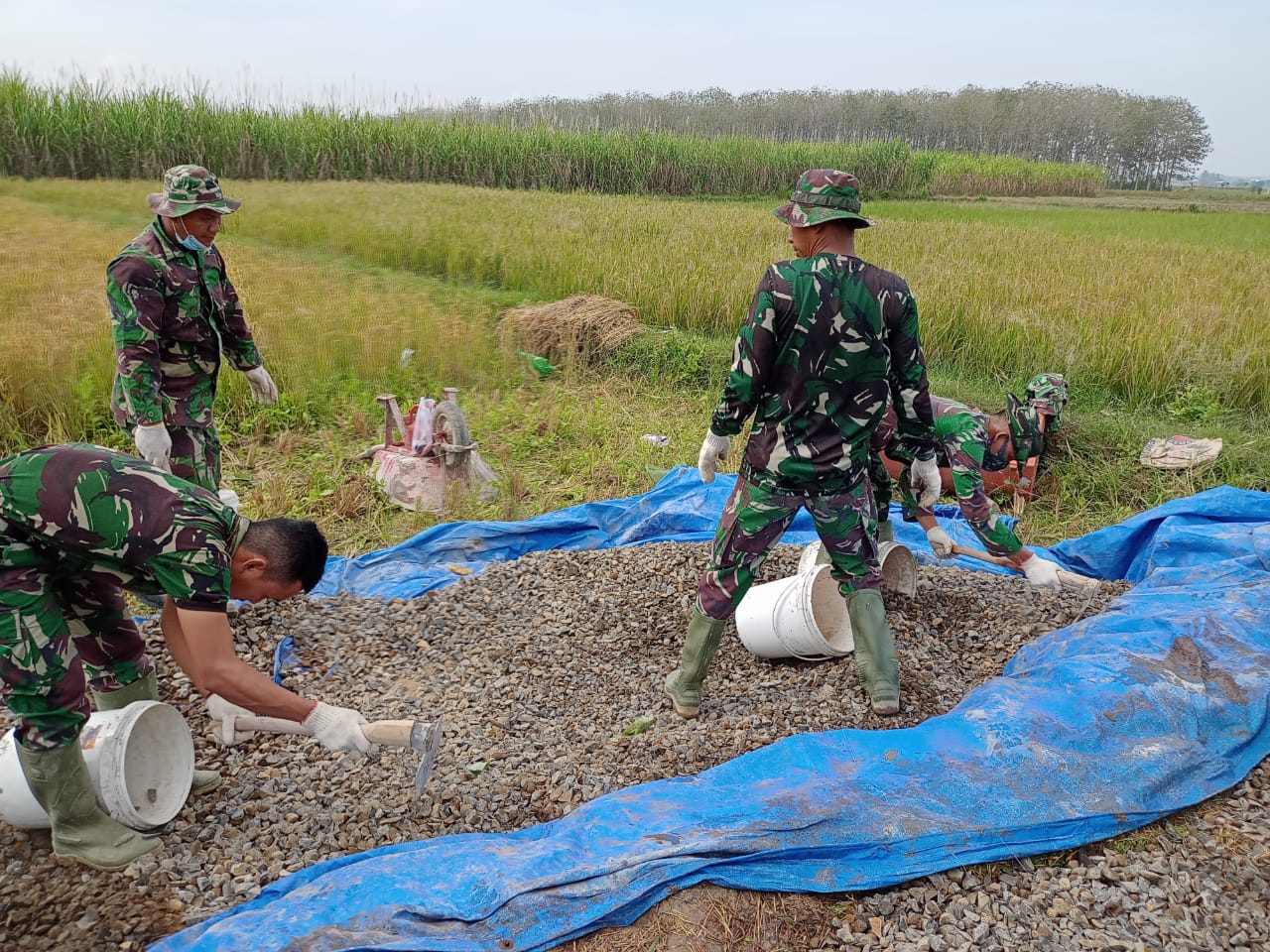 Dalam pelaksanaan tugasnya, terlihat dilokasi anggota TNI Kodim 0718/Pati yang ada di Desa Tamansari ini bekerja dengan penuh semangat, sabar dan ulet. Saat ini mereka sedang mepersiapkan material untuk pembuatan adukan.
