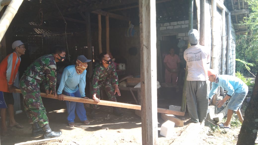 Seperti yang dilakukan oleh TNI dan warga Desa Tamansari ini misalnya, mereka berkolaborasi menjadi satu dengan kompak berusaha mengangkat balok atap untuk meninggikan tiang karena di bawahnya akan dipasang dinding.Selasa,(08/06/2021).