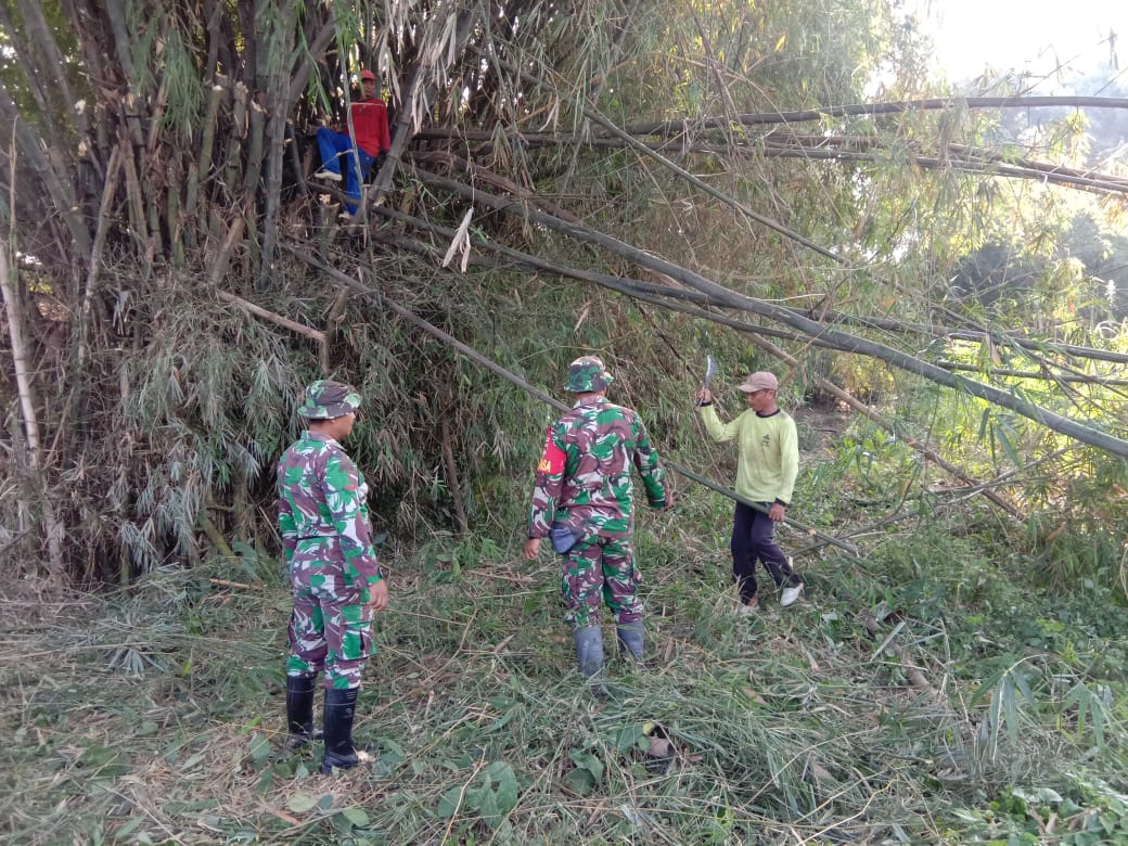 Serda Triatmojo (39) mengatakan TNI bersama masyarakat saling bergotong-royong memotong bambu yang rencana semula akan digunakan dirumah milik Suti’ah, untuk membawa rencana akan dipikul bersama karena jarak dari pekerjaan ke pemotongan bambu relatif dekat.