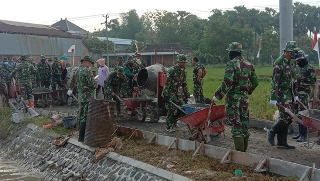 Pati – Personel Satgas TMMD Reguler ke-111 Kodim 0718/Pati dibantu dengan warga melakukan pengecoran jalan persawahan di Desa Tamansari, Kecamatan Jaken, Kabupaten Pati, Minggu (04/07/2021).