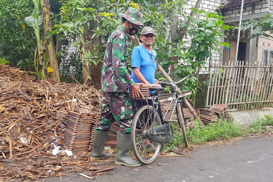 Pati – Tidak ada istilah canggung bagi TNI anggota Satgas untuk selalu membantu selulitan warga di lokasi TMMD. Tampak Serda Sukarji sedang membantu Suparman (60) warga Dukuh Kemiri, Desa Tamansari, Kecamatan Jaken, Kabupaten Pati, saat ia melansir genteng untuk dibawa kerumahnya, Jum’at (18/6/2021)