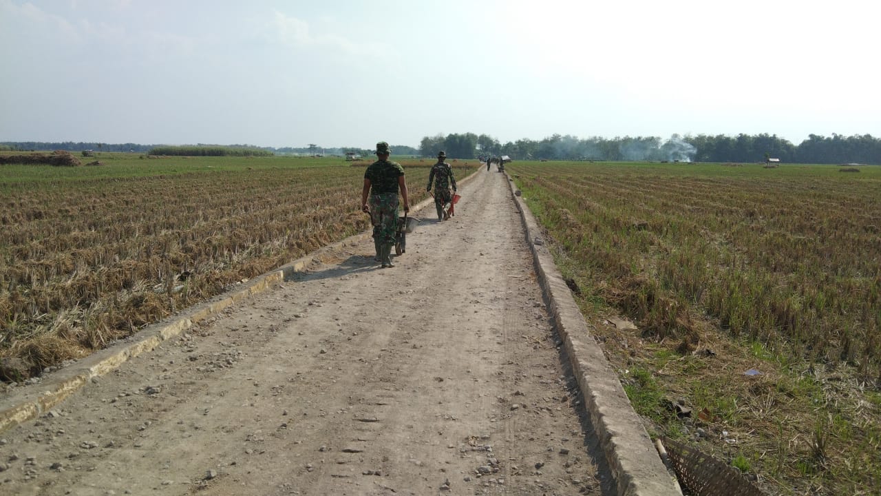 Para prajurit TNI ini tetap semangat dalam melaksanakan pembangunan pengecoran jalan di Dukuh Pandahan Desa Tamansari Kecamatan Jaken Kabupaten Pati.