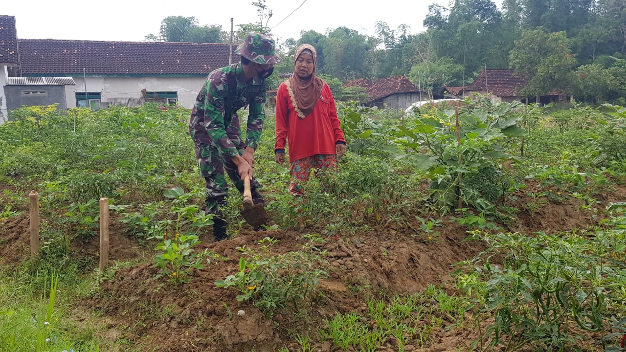 Terlihat Ibu Rasmi sedang membersihkan rumput liar disekitar tanaman sayurannya. Kesempatan tersebut tidak disia-siakan Serda Sukarji untuk membantunya, sembari berbincang-bincang seputar tanaman sayuran.