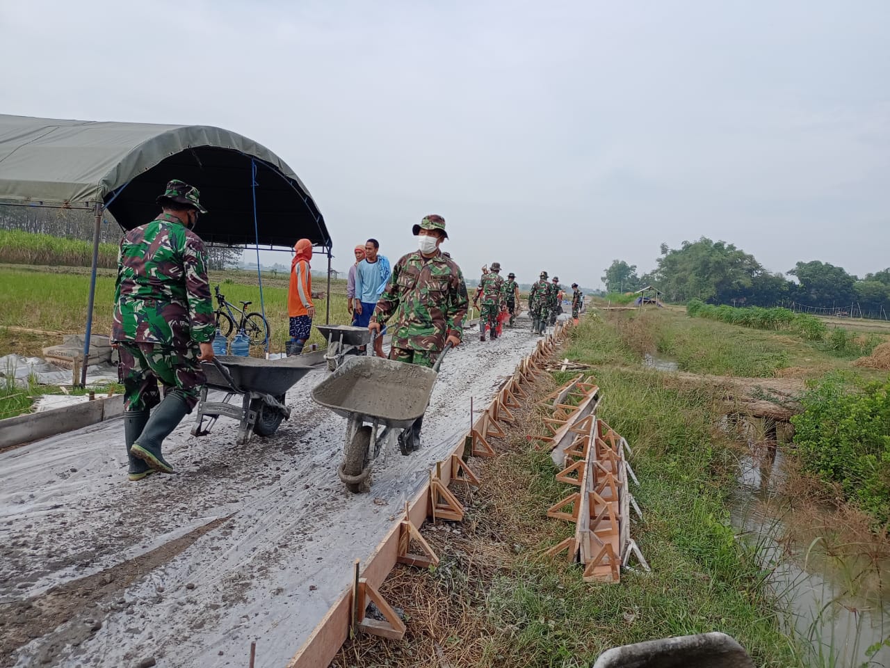 Terlihat setiap hari Para Personil TNI dan warga bersama sama membangun jalan rabat beton. Mereka bersama-sama mengangkat semen dari tempat penyimpanan untuk didekatkan kemesin molen, biar mempermudah untuk dimasukan kemesin molen.