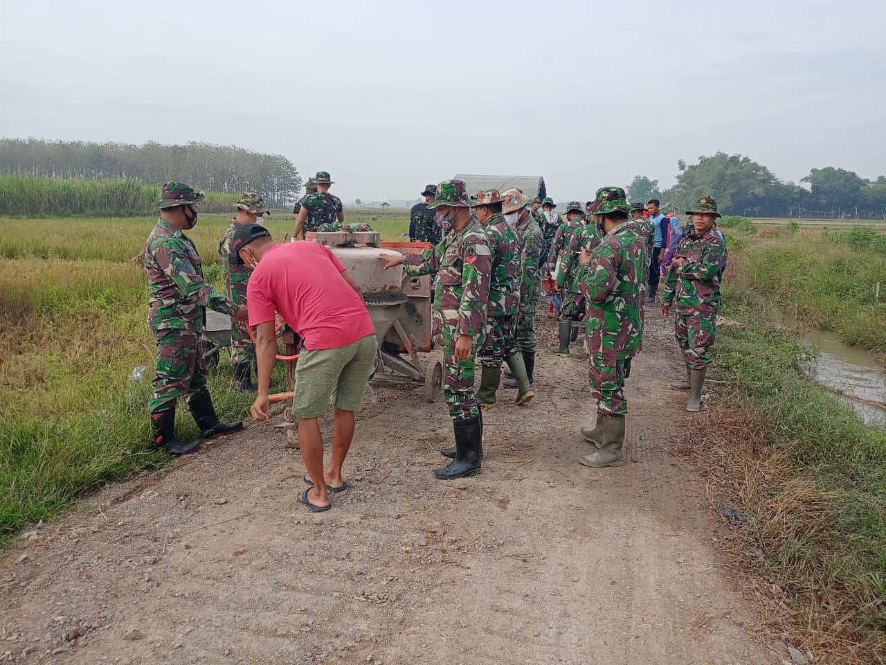 Untuk kelancaran pembangunan jalan desa yang sedang di Betonisasi, dan memastikan semua bahan material yang dipergunakan adukan tersedia, Anggota TNI yang tergabung dalam satuan tugas TMMD ini dengan sigap dan tanggap segera berkumpul untuk membantu pergeseran mesin molen ke tepi jauh dari lokasi awal.