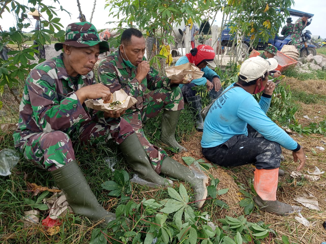 Seperti yang dilakukan Serda Rajio dan anggota satgas lainnya, demi dekat dengan warga, dia rela bergabung warga makan siang di kebun yang tidak jauh dari lokasi pekerjaan TMMD.