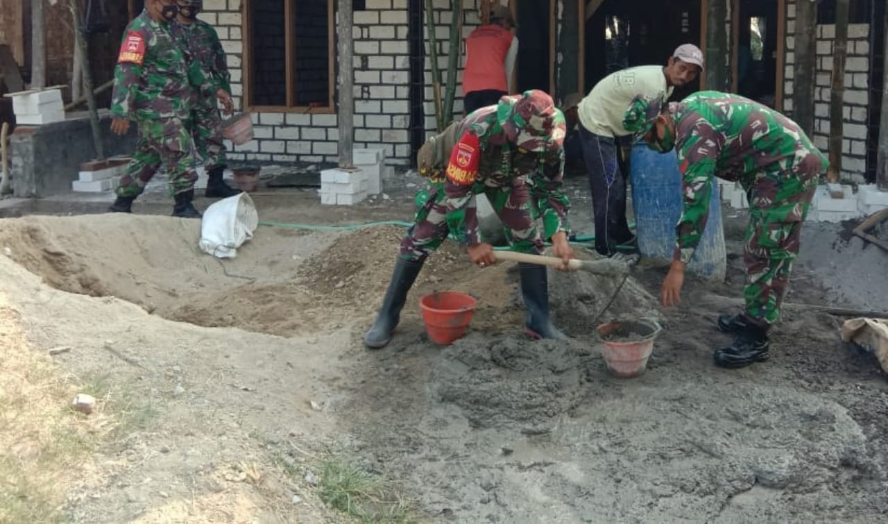 Seperti dalam proses perehaban RTLH milik Santoso (55) Rt.02 RW.02 Dusun Pandahan Kecamatan Jaken yang saat ini terus dikerjakan. Sudah menjadi kebiasaan, beberapa Tentara anggota Satgas Pra TMMD yang mengaduk campuran Semen dan pasir untuk pemasangan batu bata putih dinding RTLH milik Santoso, sementara warga bersama anggota satgas lainnya yang membagikan untuk didekatkan dengan lokasi pekerjaan pemasangan batu bata putih.