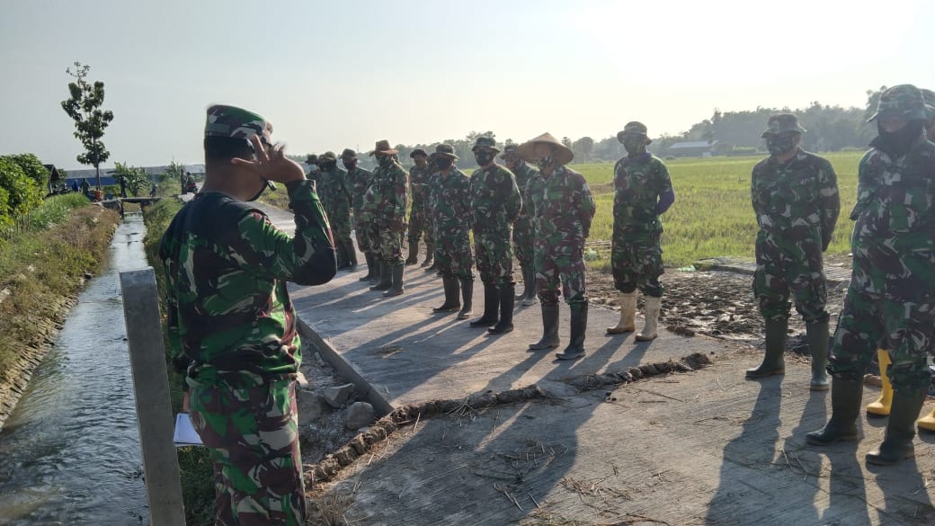Pati, -Prajurit yang tergabung dalam Satgas TMMD Reguler ke-111 TA 2021 Kodim 0718/Pati di Desa Tamansari, Kecamatan Jaken, Kabupaten Pati melaksanakan apel pengecekan di lokasi sebelum melaksanakan tugas. Selasa (06/07/2021).