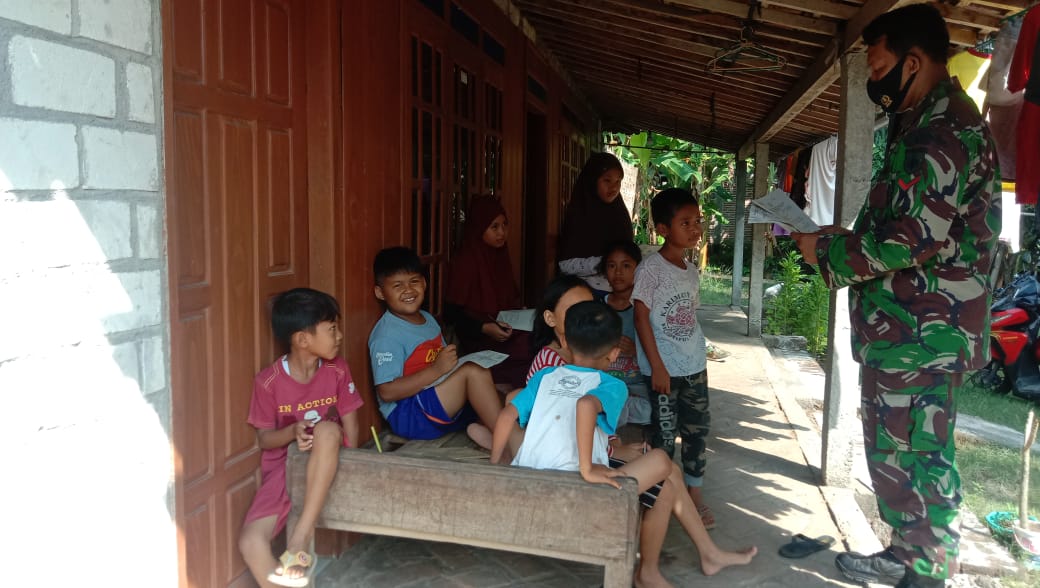 Dengan cerita-cerita pengalaman tugasnya sewaktu dulu di daerah Ambon Maluku, terlihat kopda Bowo bersama anak-anak menghampiri kegiatan belajar kelompok.