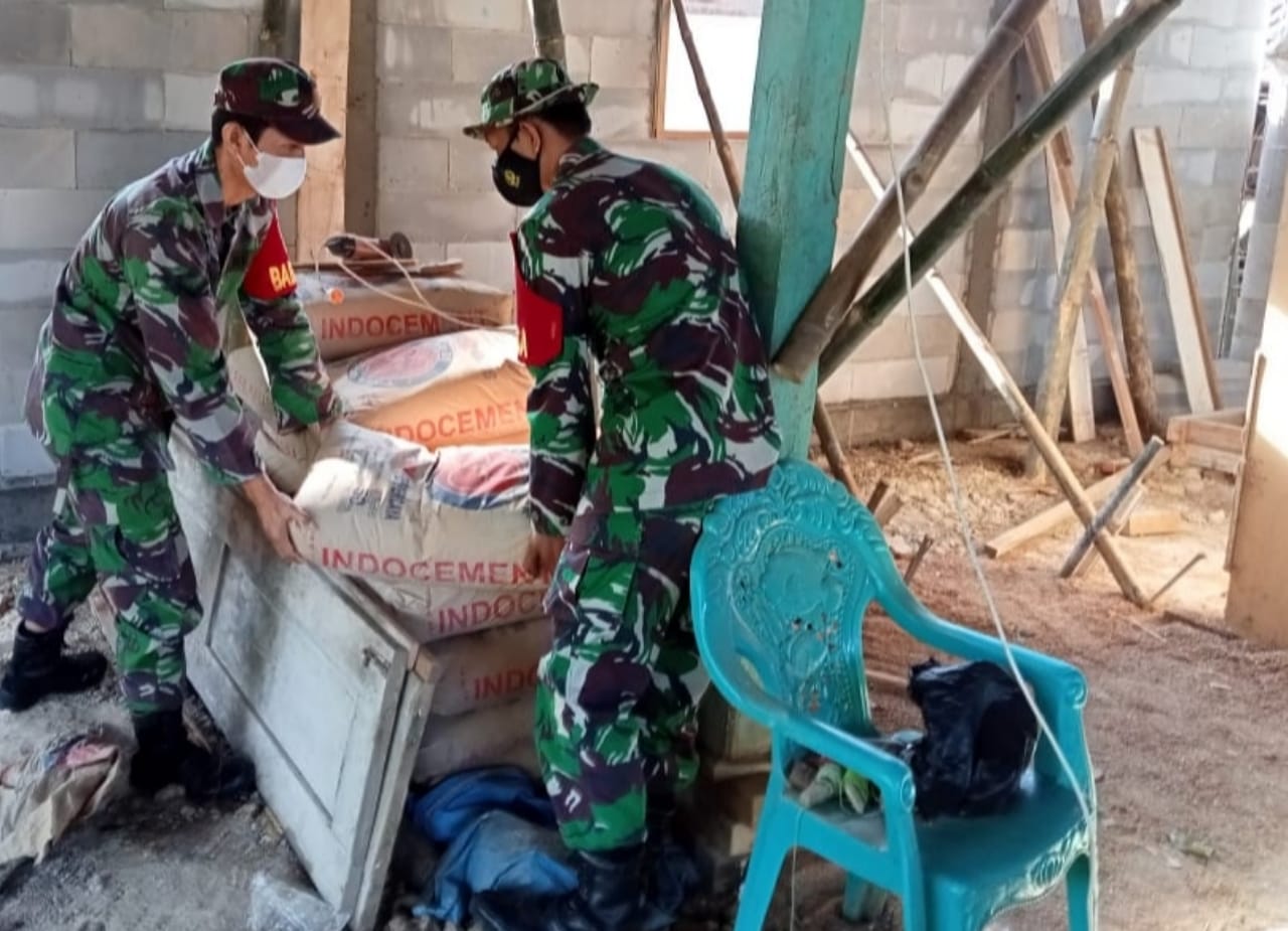 Pati – Percepatan pembangunan sasaran fisik TMMD bedah Rumah Tidak Layak Huni (RTLH) program Tentara Manunggal Membangun Desa (TMMD) Reguler ke-111 Kodim Pati, Pelda Sukarbin bersama anggota Satgas TMMD lainnya dengan semangat bergotong royong langsir bahan material berupa habel, untuk keperluan bedah rumah milik Supawi (56) warga Dukuh Kemiri RT.04/01, Desa Tamansari, Kecamatan Jaken, Kabupaten Pati, Jawa tengah, Minggu (13/6/2021).