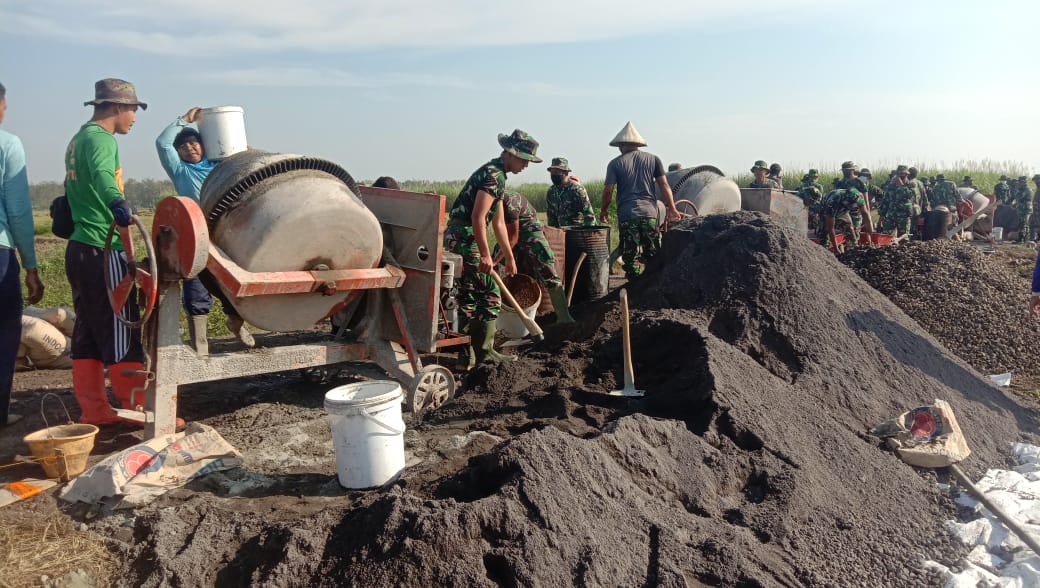 Pati – TMMD Reg. 111 berjalan satu minggu program pembangunan TNI Manunggal Membangun Desa (TMMD) Reguler ke – 111 Tahun 2021 Kodim 0718/Pati, terus dikebut fokus dalam sasaran fisik rabat beton jalan penghubung dari sawah ke Desa Tamansari, Kecamatan Jaken, Minggu (20/06/2021).