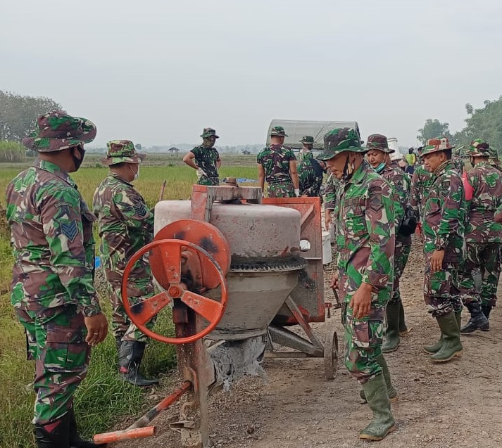 Pati- Guna menghindari kemubaziran material, anggota satuan tugas TNI Manunggal Membangun Desa (TMMD) di Desa Tamansari menggunakan lapisan terpal dibawah material. Ini dimaksudkan agar material tidak berserakan dan pengambilan juga mudah.