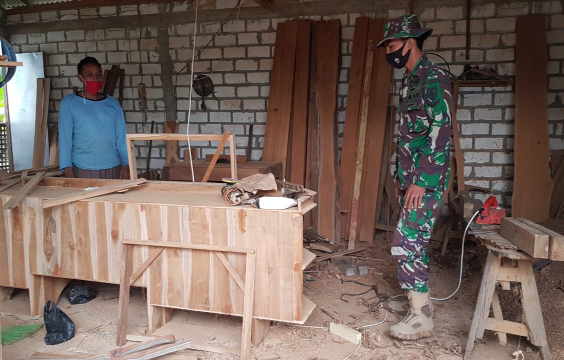 Anggota Satgas TMMD Reguler ke-111 Kodim Pati Serda Subakir melakukan kegiatan Komunikasi Sosial (Komsos) di tempat pengrajin usaha kayu Bapak Sutono (52) warga Dukuh Pandahan RT.01/03, Desa Tamansari, Kecamatan Jaken, Kabupaten Pati. Ia tampak serius dalam memperhatikan proses pembuatan meja kantor persanan dari salah satu instansi pemerintah, Selasa (15/6/2021).
