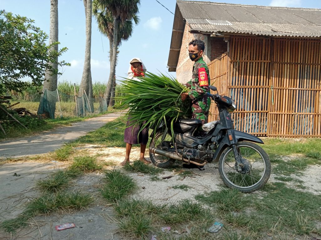 Dengan semangat dan penuh keikhlasan anggota Satgas Serda Sukarji membantu memotong dan menaikkan rumput ke atas sepeda motor. Menurutnya keterangan Kasno, rumput gajah sengaja ditanam di lahan sawahnya untuk persediaan pakan ternak sapinya. Dengan menggunakan sebuah sepeda motor butut dia membawa rumput cukup banyak.