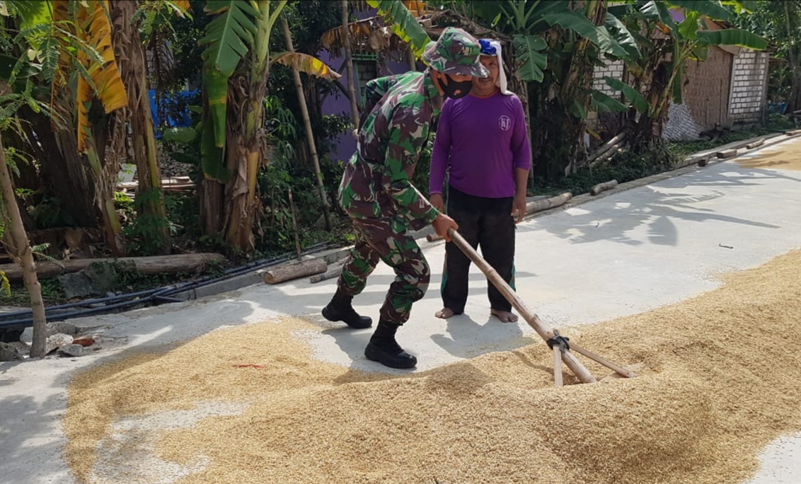 Terlihat di pelataran tempat penggilingan padi, Serda Sukarji anggota Satgas TMMD Reguler ke-111 Kodim 0718/Pati, sedang membantu Pak Hendro membalik jemuran padi agar bisa kering merata. Dia pun merasakan beratnya menyorok padi dengan papan kayu yang diberi gagang,