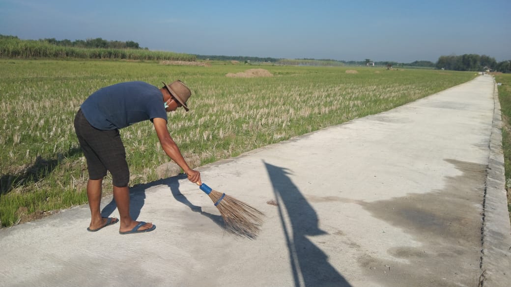 Pati – David (32), warga Desa Tamansari,Kecamatan Jaken, Kabupaten Pati, tampak terlihat tengah menyapu krikil yang berada dilokasi jalan penghubung antar desa yakni Desa Tamansari, menuju Desa Sumberarum pasca penutupan TMMD Reguler -111 Kodim 0718/ Pati tahun 2021.