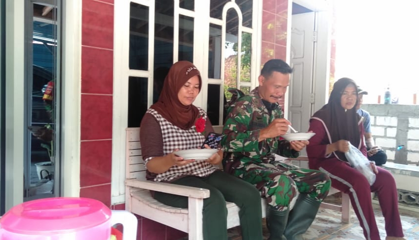 Pati – Pelda Sukarbin anggota Satgas TMMD Reguler ke-111 Kodim 0718/Pati terlihat sedang makan bareng bersama Sutinah (57) warga Desa Tamansari, Kecamatan Jaken, Kabupaten Pati, yang merupakan ibu asuh selama tinggal di rumahnya dalam pelaksanaan kegiatan TMMD, Kamis (24/6/2021).