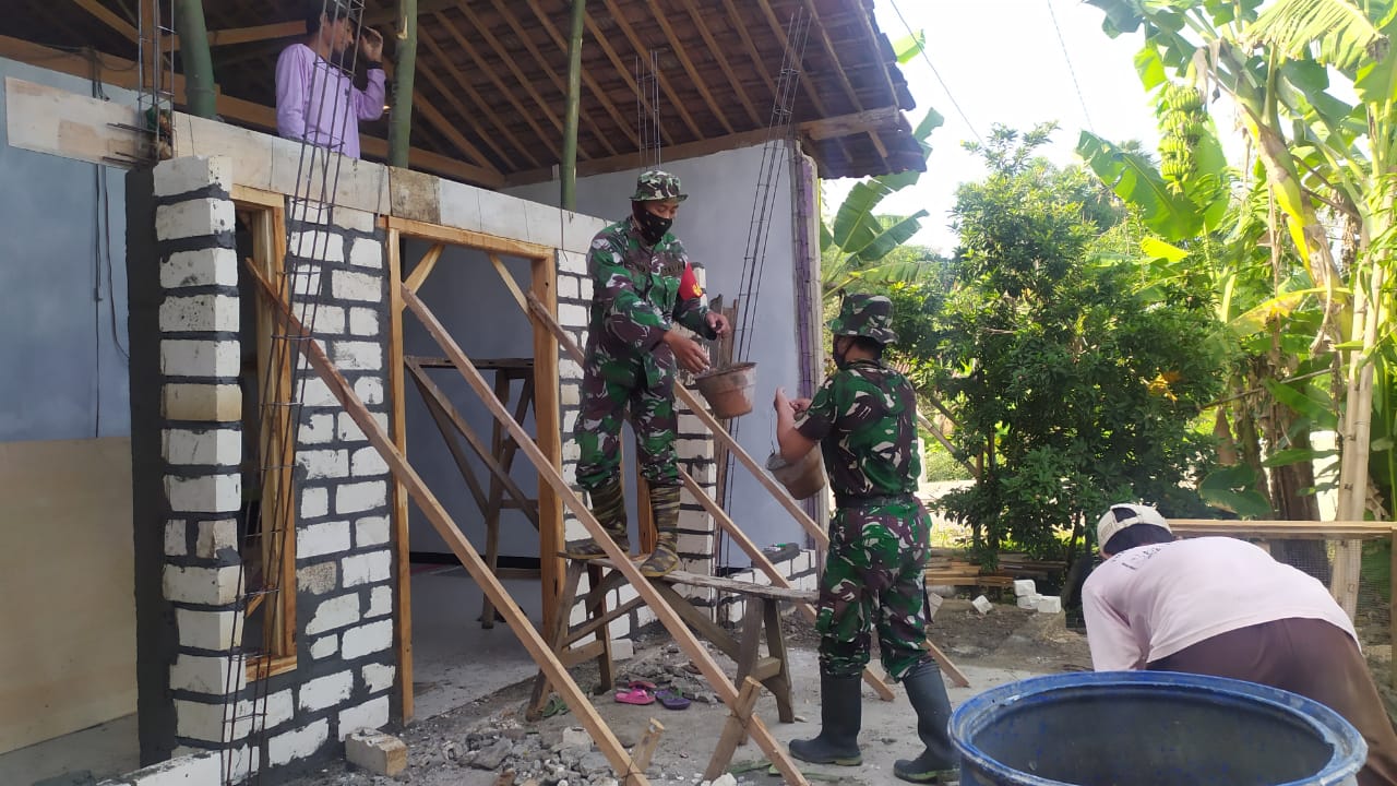 Pati – Anggota Satgas TNI Manunggal Membangun Desa (TMMD) 111 melaksanakan rehab Rumah Tidak Layak Huni (RTLH) milik Ngarji (72) di Desa Tamansari Kecamatan Jaken Kabupaten Pati, terus dilakukan oleh warga dan personel Satgas Pra TMMD Reguler 111 Kodim 0718/Pati. Sabtu (12/6/2021).