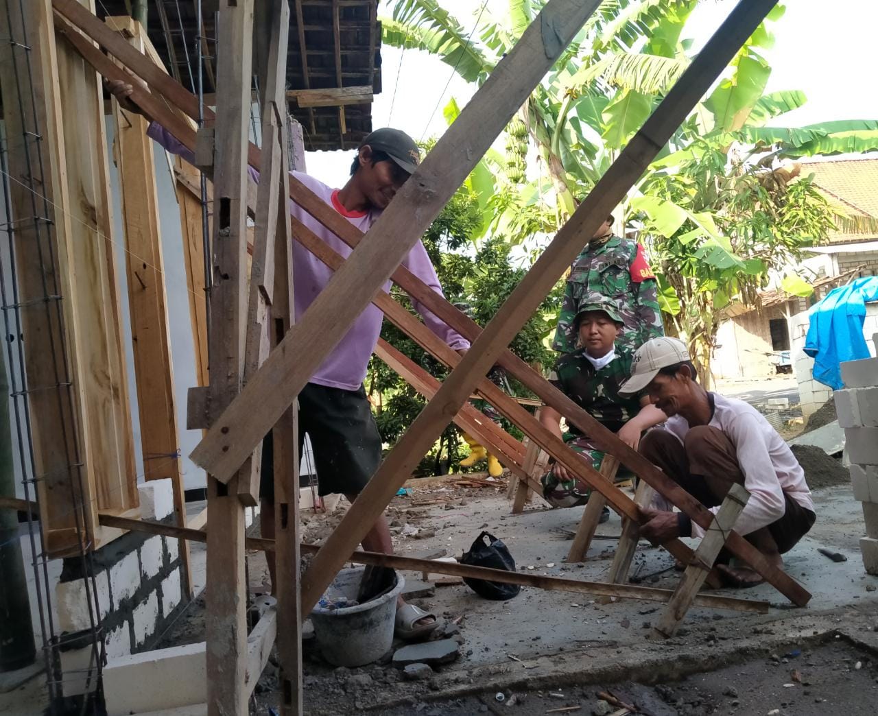 Pati- Saling bahu-membahu mengikuti instruksi sang ahli, dalam hal ini sebagai pemegang komando ialah tukang ahli bangunannya saat pelaksanaan pemasangan Kusen Pintu dan Jendela dalam pembangunan Rumah Tidak Layak Huni(RTLH) milk Ngarji(57), warga RT 03/RW 02 Desa Tamansari Kecamatan Jaken Kabupaten Pati. Kamis,(10/06/2021).