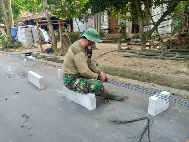 PATI – Satgas Tentara Manunggal Masuk Desa (TMMD) yang ke-111 Kodim 0718/Pati di Desa Tamansari merangkai besi begel sloof untuk pengerjaan rehab Rumah Tidak Layak Huni (RTLH).
