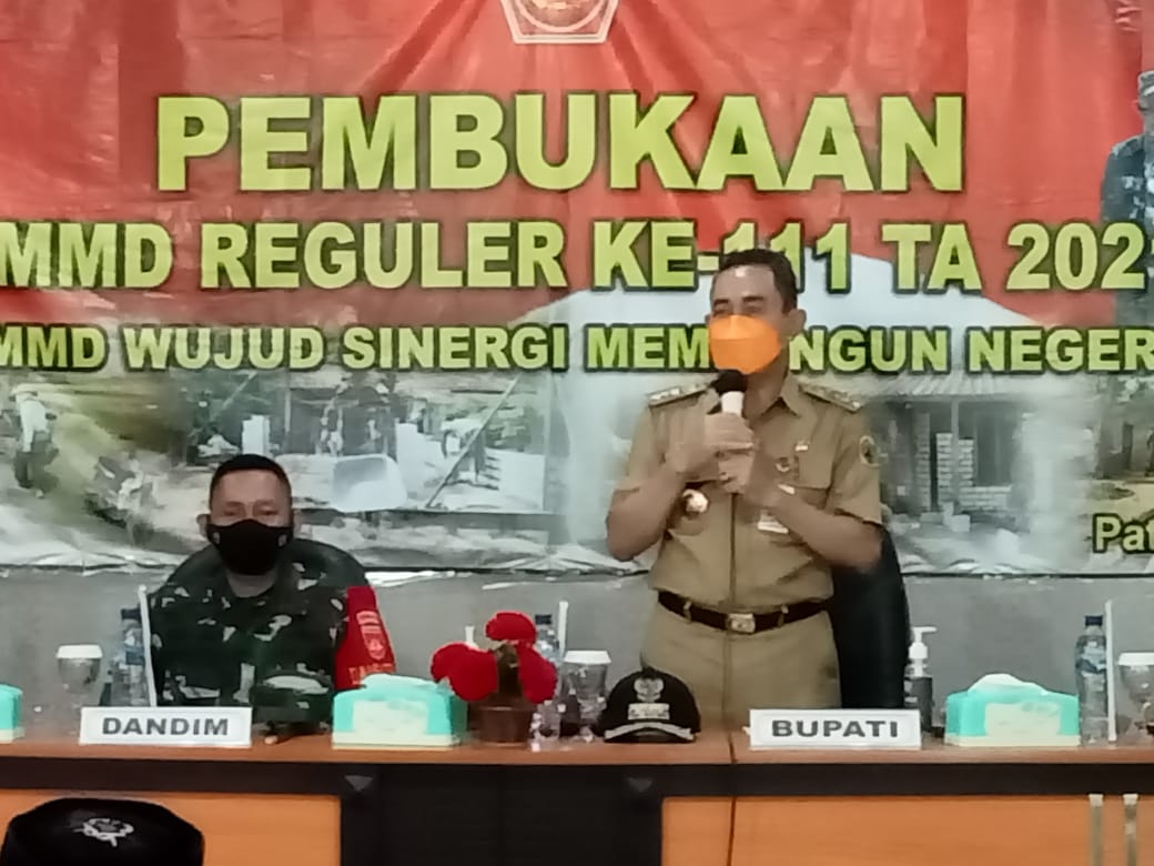 Pati – Bupati Pati H. Haryanto, SH, MM, M.Si membuka kegiatan TNI Manunggal Membangun Desa (TMMD) Ke-111 TA. 2021 Kodim 0718/Pati, Selasa 15 Juni 2021. TMMD yang pada tahun ini di pusatkan di Desa Tamansari Kecamatan Jaken yang akan di gelar selama 30 hari kedepan.