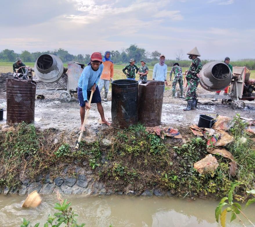 Pati – TNI Manunggal Membangun Desa (TMMD) reguler ke 111 Kodim 0718/Pati dalam pengerjaan pembangunan jalan betonisasi yang menghubungkan antara Desa Tamansari menuju Desa Sumberarum saat ini TNI bersama masyarakat terus kebut pekerjaan. Dalam membuat adonan cor ada yang bertugas menampung air kedalam drum karena bila air dari saluran irigasi langsung digunakan dikawatirkan lumpur akan ikut tercampur karena belum di endapkan.