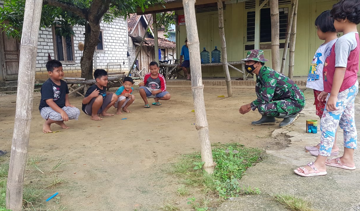 Terlihat Serda Sukarji salah satu anggota Satgas TMMD Reguler ke-111 Kodim Pati sedang bermain kelereng dengan anak-anak Desa Tamansari. Banyak jenis permainan yang mereka peragakan, mereka pun terlihat asyik menikmati permainan tersebut, Sabtu (19/6/2021).